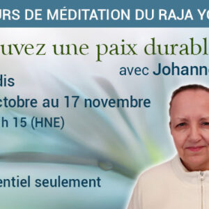 Cours de méditation du Raja Yoga en présentiel Quatre séances pour apprendre à mieux gérer vos pensées et ... 03 Nov 7:00 pm - 8:15 pm L’Émergence | Le centre de méditation Brahma Kumaris à Montréal7501, rue Saint-Denis Montréal, Québec H2R 2E7