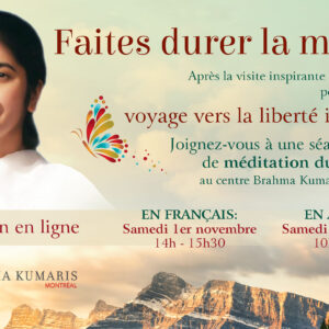 Les super pouvoirs de l’âme Prérequis: Cours de méditation En présentiel et sur Zoom Partez à la ... 27 Oct 7:00 pm - 8:15 pm L’Émergence | Le centre de méditation Brahma Kumaris à Montréal7501, rue Saint-Denis Montréal, Québec H2R 2E7